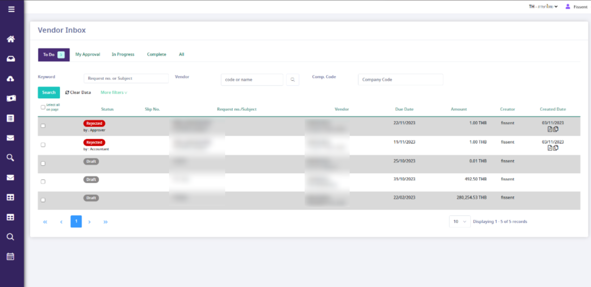 Module : Vendor เป็นระบบช่วยบริหารการจ่ายเงินและออกใบเสร็จให้กับ Vendor ของบริษัทในลักษณะของ Self Service โดย Vendor ที่ลงทะเบียนจะสามารถส่งเอกสาร Payment Request พร้อมเอกสารแนบต่างๆ เข้าสู่ระบบ เพื่อระบบนำมาเปรียบเทียบกับข้อมูลใน ERP พร้อมช่วยคำนวณการบันทึกบัญชีและภาษี จากนั้นส่งเอกสารให้ผู้อนุมัติที่เกี่ยวข้องตามขั้นตอน ซึ่งแต่ละฝ่ายสามารถตรวจสอบและใช้งานได้โดยสะดวก รวมทั้ง Vendor สามารถติดตามความคืบหน้าของเอกสารการเบิกจ่ายได้