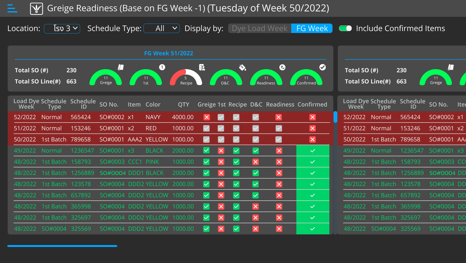แสดงรายการแผนย้อม พร้อมรายละเอียดความพร้อมของแต่ละรายการ และสรุป Progress ของแต่ละ Week เพื่อให้ทาง SCM เห็นความพร้อมของแผนก่อนที่จะย้อมได้
