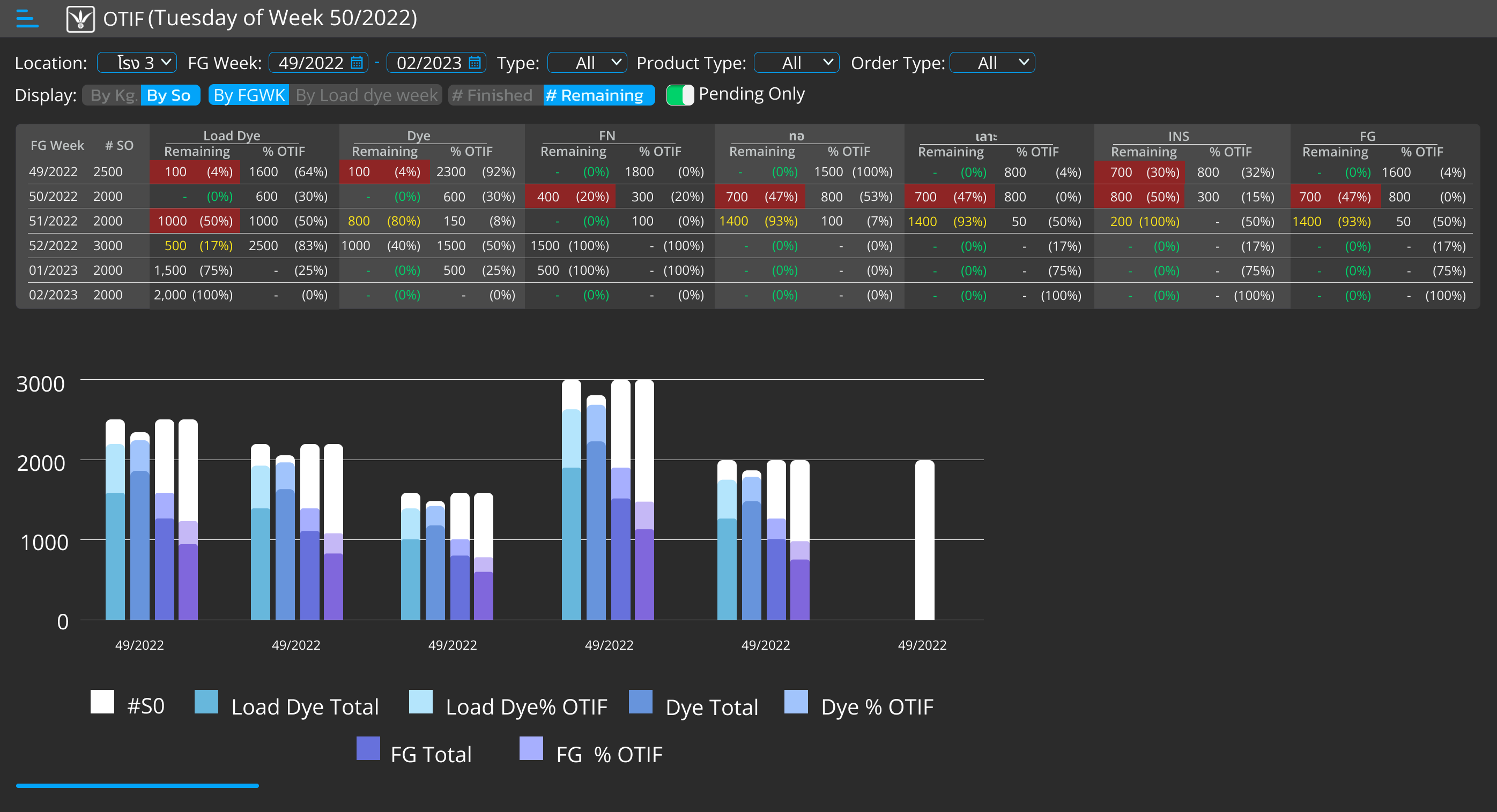 แสดงสรุปของแต่ละ Week ว่า มี SO ค้างอยู่ในกระบวนการใดเท่าไหร่ พร้อมทั้งแสดง OTIF ของแต่ละกระบวนการ เพื่อให้เห็นภาพรวมของกระบวนการว่ารายการ SO อยู่ที่ขั้นตอนไหน พร้อมทั้งแสดงยอด OTIF ที่คำนวณได้ตาม Week เพื่อนำมาปรับปรุงการทำงานได้ โดยสามารถดูได้ 2 มุมมองคือมุมมอง FG Week และ Load dye week และยังสามารถดูรายละเอียดของรายการที่ยังค้างอยู่ได้