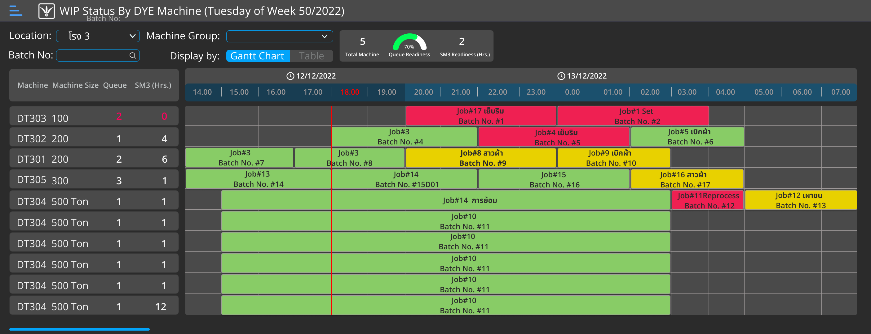 แสดงรายการคิวย้อมของแต่ละ Machine ตามโรงย้อม เพื่อให้ทางทีม Fabric Center, PPC เห็นความพร้อมของคิวที่จะย้อม และสามารถตรวจสอบแต่ละคิวได้ว่าพร้อมที่จะย้อมตามคิวที่วางไว้หรือไม่ โดยสามารถดูได้ทั้งในมุมมองของ Gantt chart และ Table
