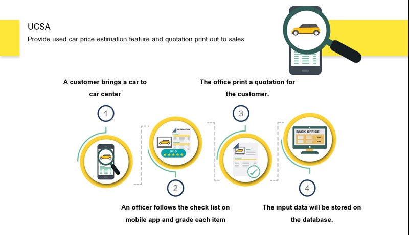 พัฒนาแอปพลิเคชันบนมือถือสำหรับงานขาย เพื่อบันทึกรายละเอียดการตรวจสภาพรถ ประเมินราคารถยนต์มือสอง และสร้างแบบฟอร์มใบเสนอราคาได้ทันที